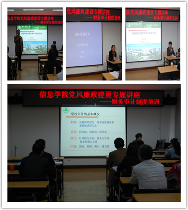 为深入学习领会习近平总书记和李克强总理关于党风廉政建设的一系列重要讲话精神,进一步加强党风廉政建设,逐步实现廉政建设的标准化、规范化和制度化。近日,信息学院邀请校审计处和财务处的负责人开展党风廉政建设专题讲座–财务审计制度培训,学院全体教职工出席。