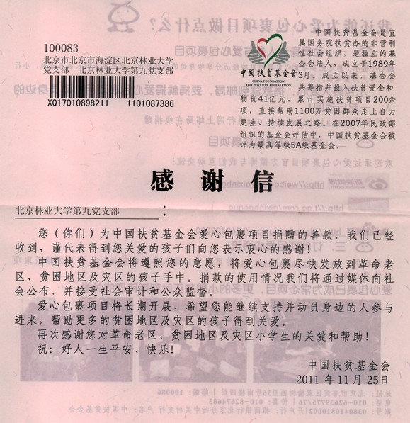 日前,信息学院学生第九党支部发起了为中国扶贫基金会爱心包裹项目捐赠的活动。该活动得到学院党委的大力支持。中国扶贫基金会向我院学生第九党支部发来感谢信。感谢我院学生党员为中国的扶贫事业做出的贡献。